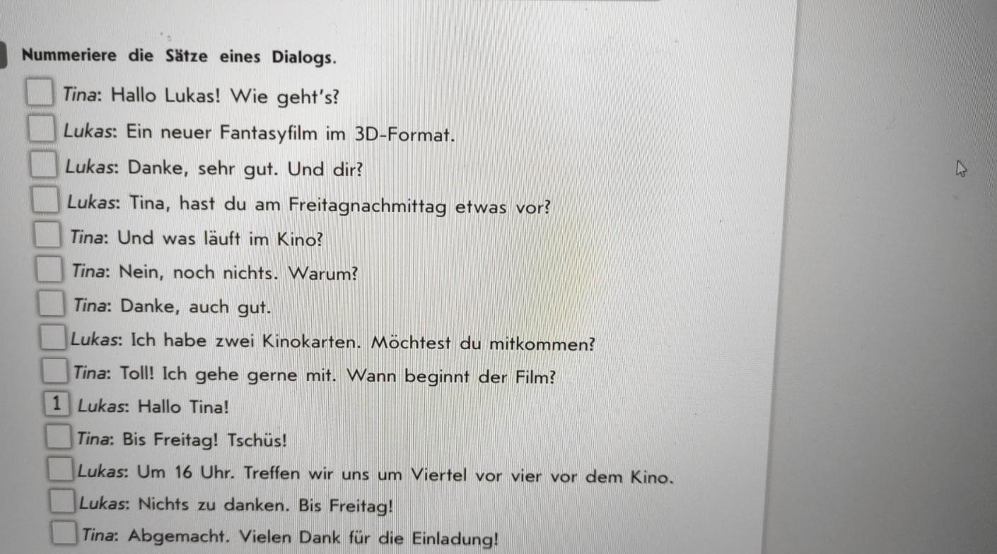 8. Lukas: Ich habe zwei Kinokarten. Möchtest du mitkommen?