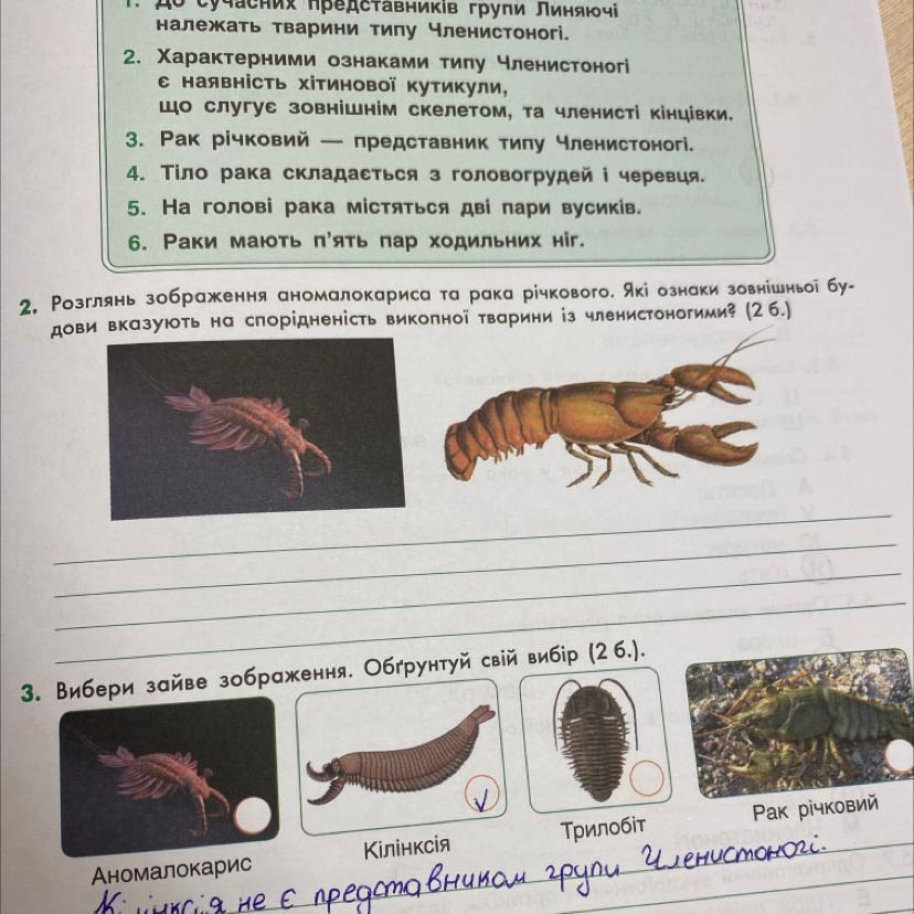 2. Розглянь зображення аномалокариса та рака річкового. Які ознаки зовнішньоï бу-