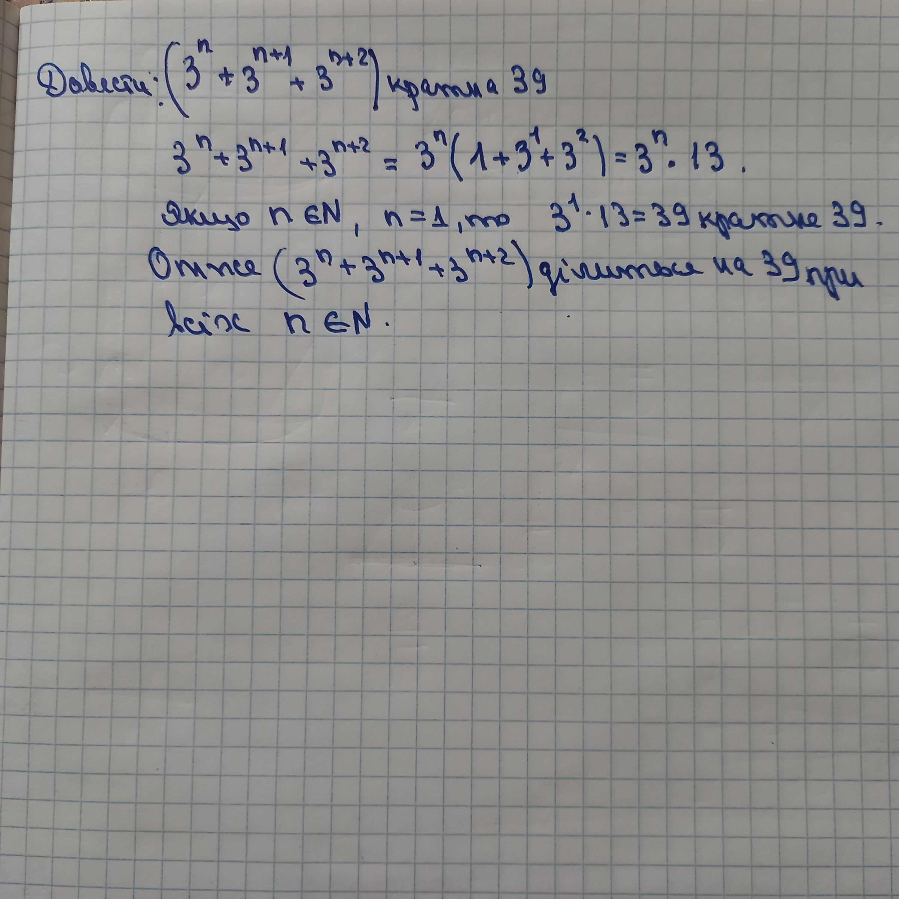 Доведіть, що сума трьох послідовних степенів числа 3 ділиться на 39