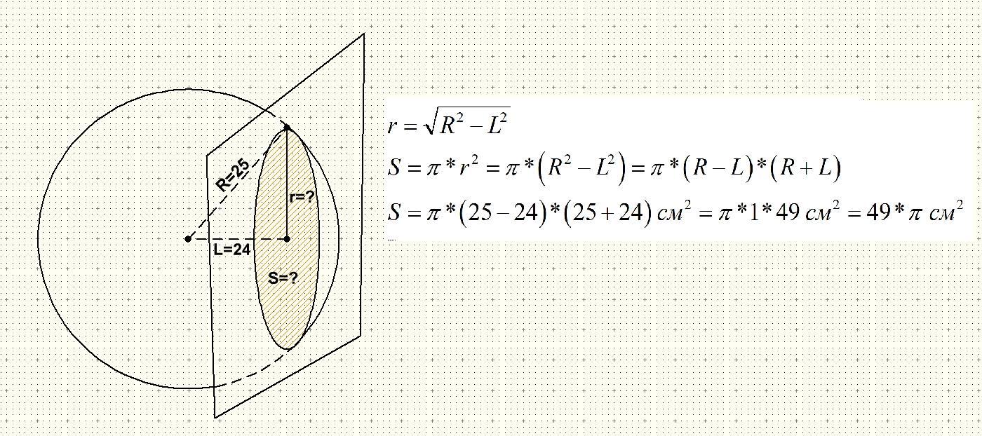 Кулю, радіус якої 25 см, перетнуто площиною на відстані 24 см від її центра. Знайдіть площу утвореного перерізу.