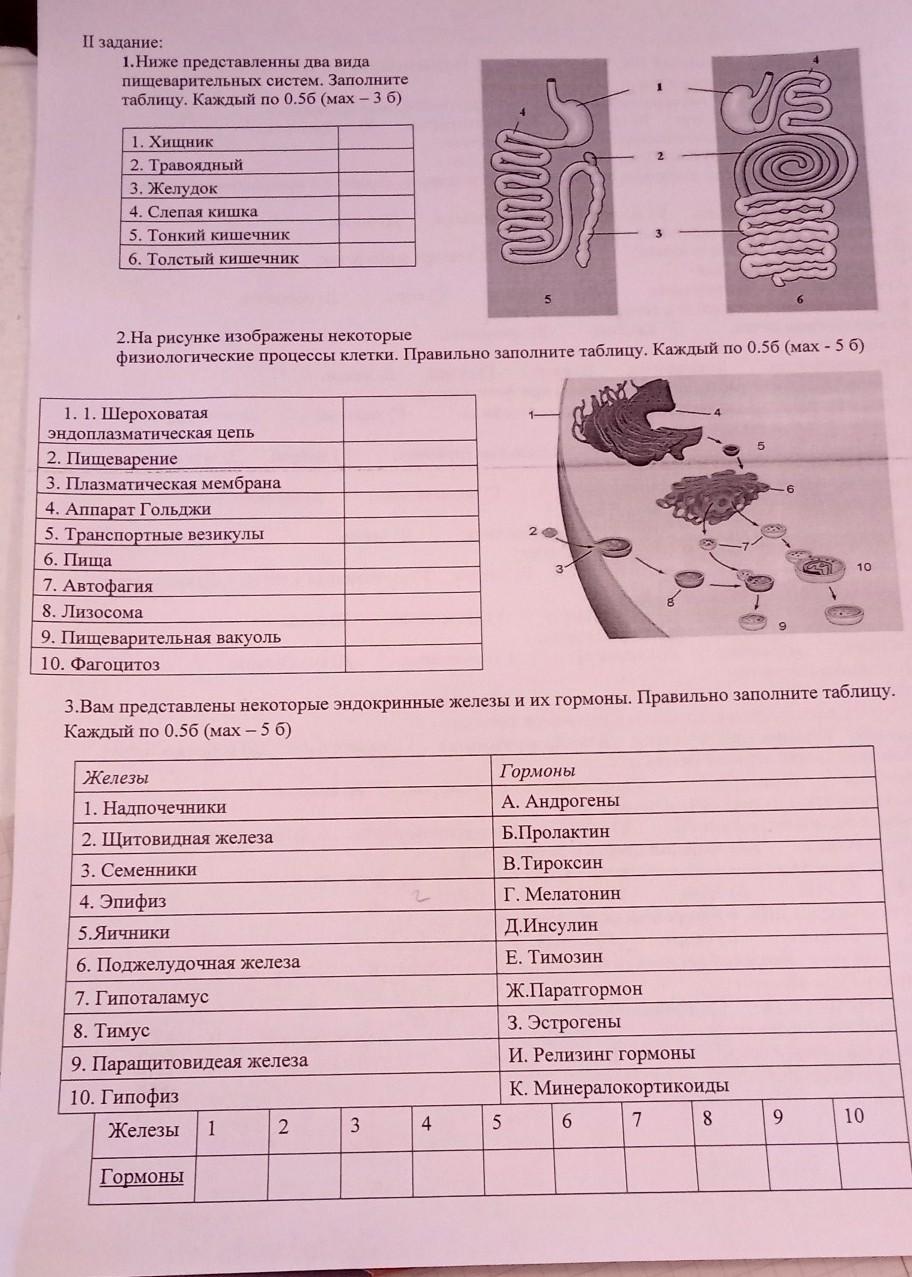 II задание: 1. Ниже представленны два вида пищеварительных систем. Заполните таблицу. Каждый по 0.5б (мах - 3 б) 1. Хищник 2. Травоядный 3. Желудок 4. Слепая кишка 5. Тонкий кишечник 6. Толстый кишечник 1. 1. Шероховатая эндоплазматическая цепь 2. Пищеварение 3. Плазматическая мембрана
