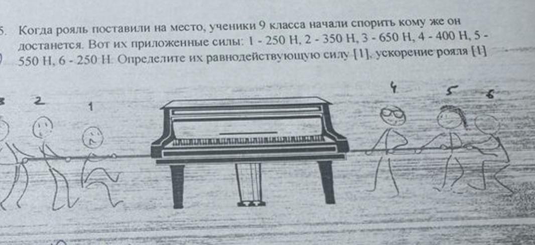 Когда рояль поставили на место, ученики 9 класса начали спорить кому же он достанется. Вот их приложенные силы: 1 - 250 Н. 2 - 350 H, 3 - 650 H, 4 - 400 H, 5 -