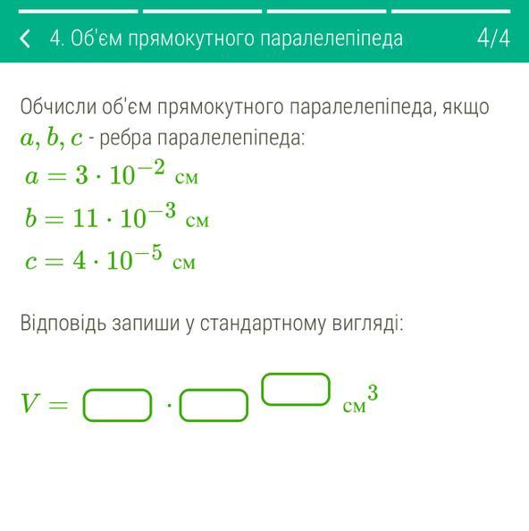 Обчисли об'єм прямокутного паралелепіпеда, якщо