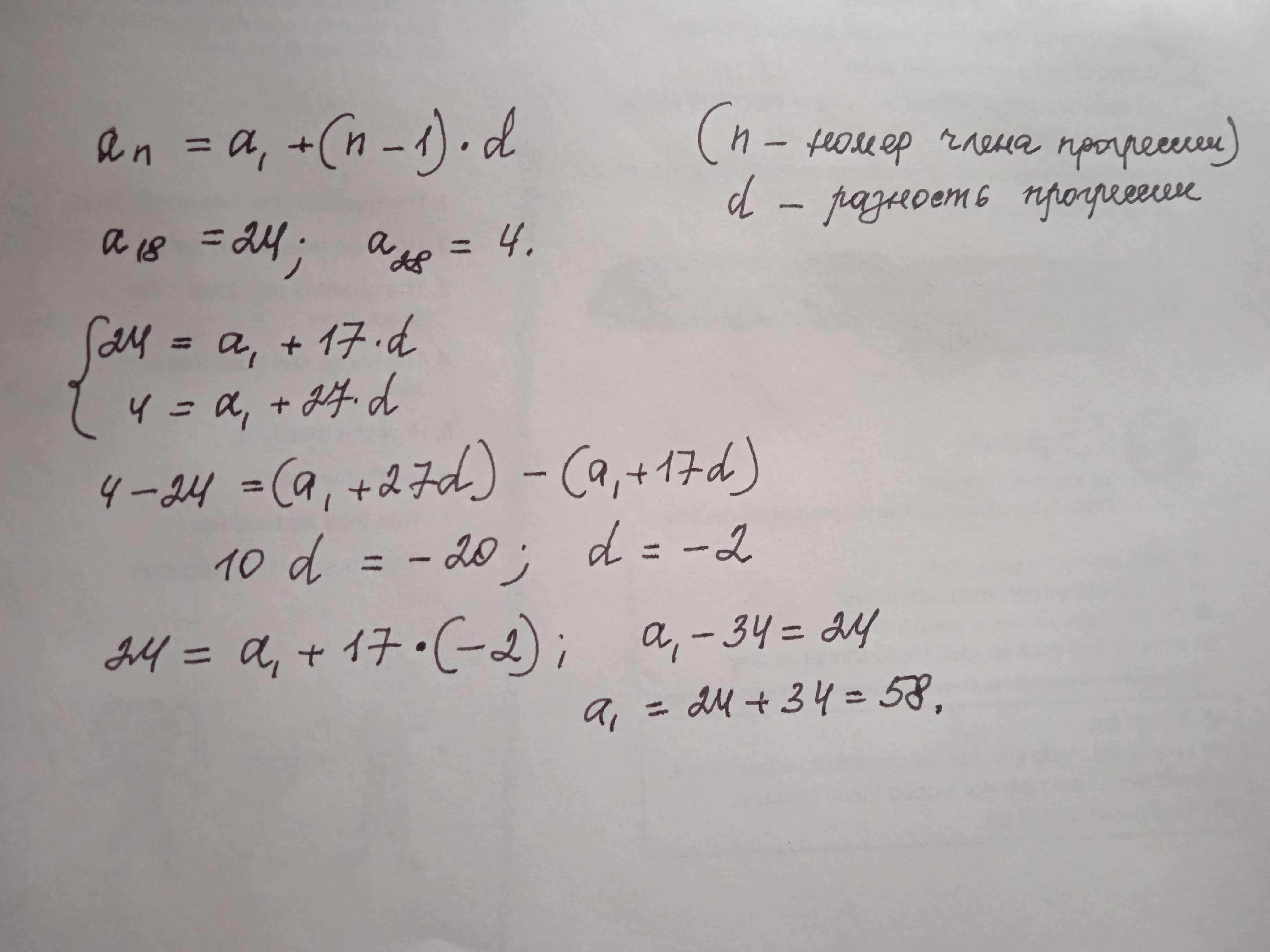 Теперь зная общую разность мы можем найти первый член прогрессии a1 из уравнения a18=a1+17d