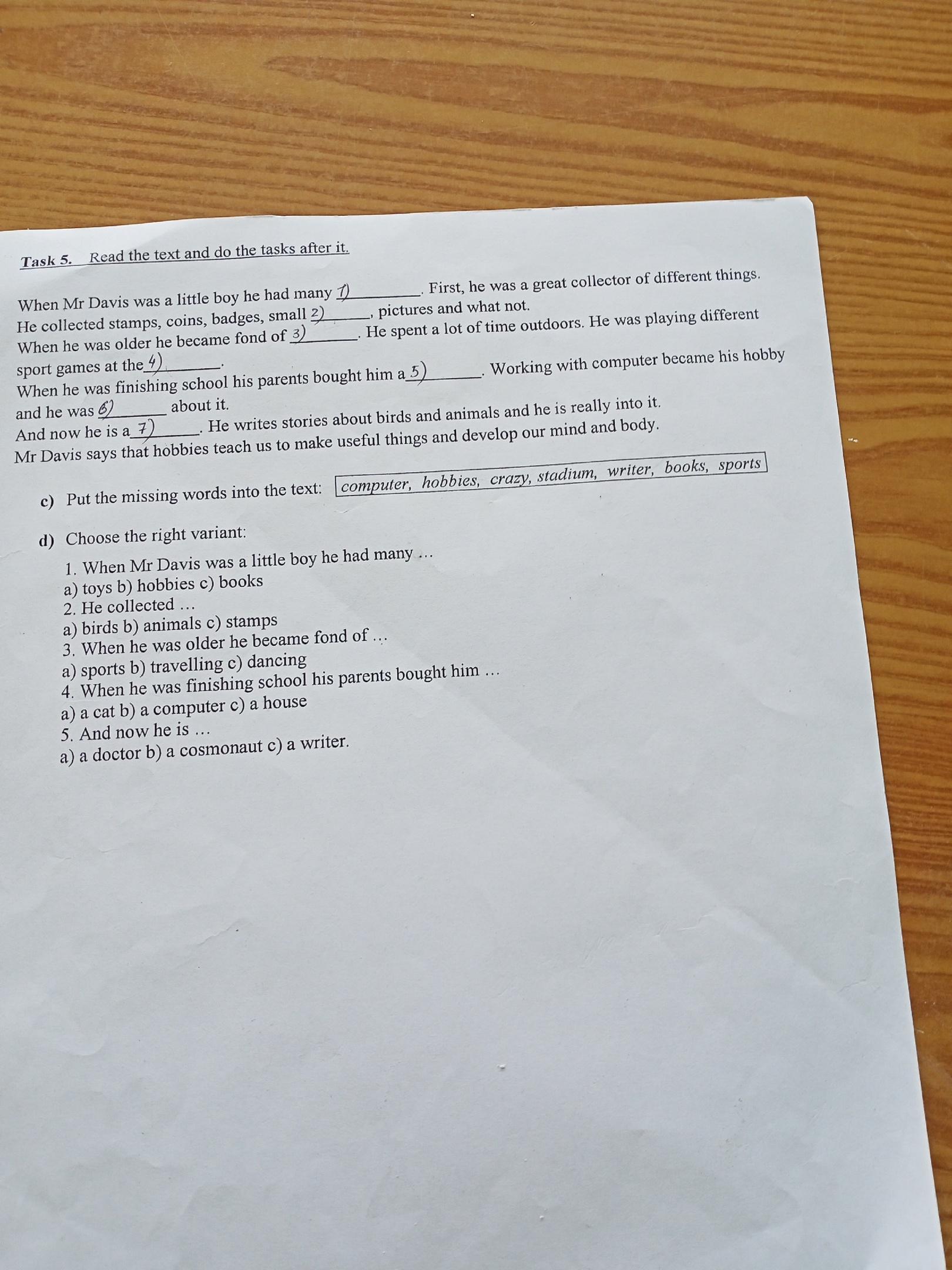 1 hobbies, 2 books, 3 sports, 4 stadium, 5 computer, 6 crazy, 7 writer