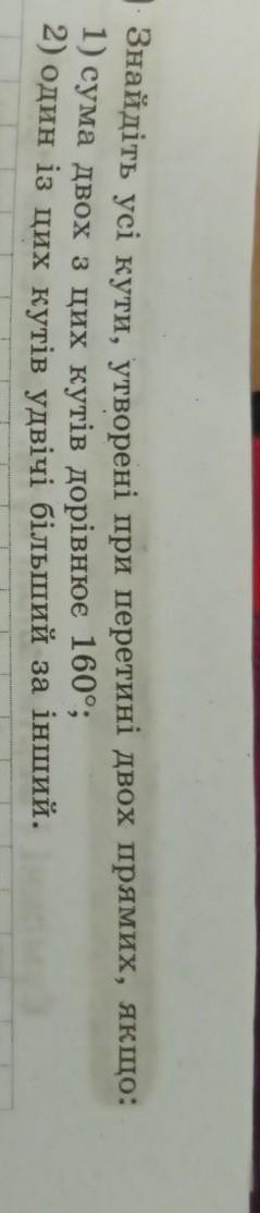 Знайдіть усі кути, утворені при перетині двох прямих, якщо: 1) сума двох з цих кутів дорівнює 160°; 2) один iз цих кутів удвічі більший за інший.