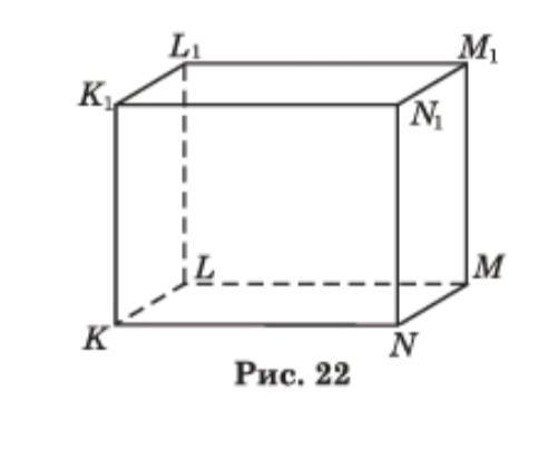 KLMNK1L1M1N1 - прямокутний паралелепіпед (рис. 22). Запишіть: 1) деякі дві прямі, паралельні площині NN1M1 2) деякі дві прямі, які перетинають площину KLM.