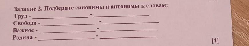 Задание 2. Подберите синонимы и антонимы к словам: Труд- Свобода - Важное - Родина - [4]