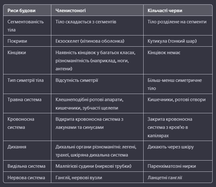 1. Порівняйте будову членистоногих та кільчастих червів, заповнивши таблицю: Риси будови: Членистоногі | Кільчасті черви Які особливості сегментованості тіла? Чим представлені покриви? Наявність кінцівок, їх особливості? Тип симетрії тіла? Чим представлена травна система? Тип кровоносної системи? Завдяки чому дихають? Чим представлена видільна система? Чим представлена нервова система?