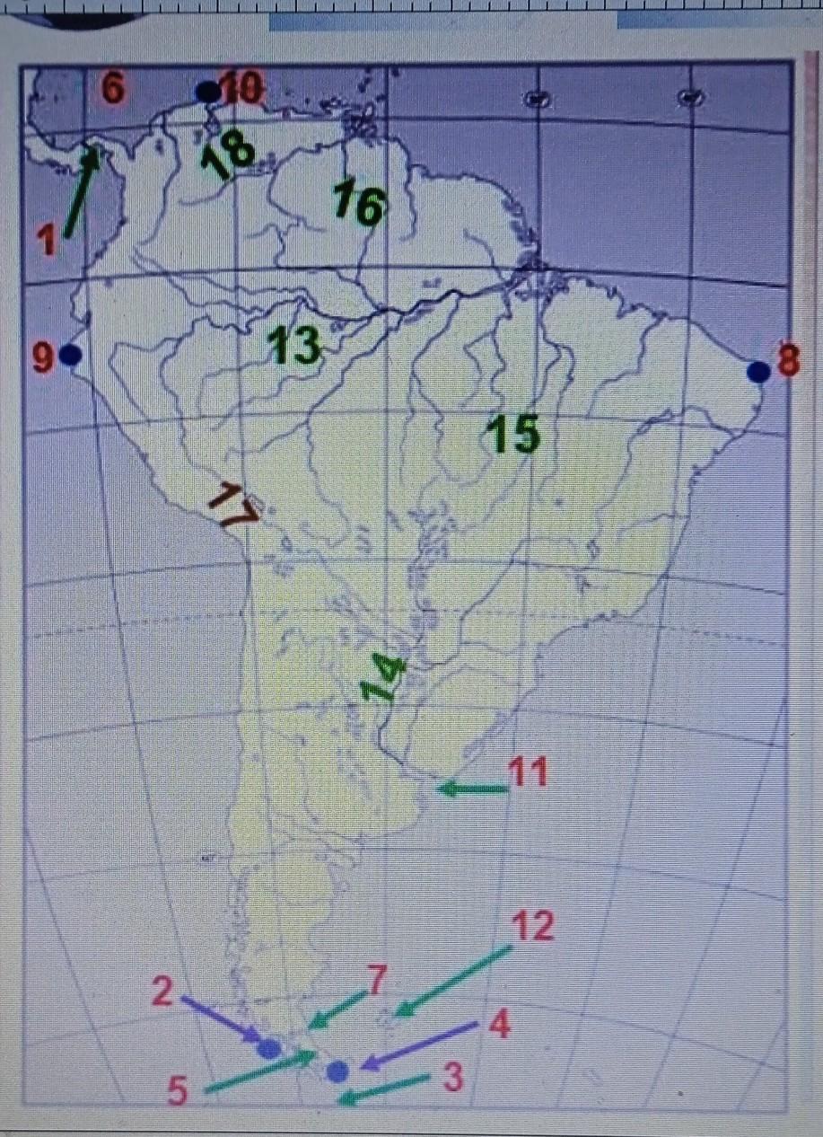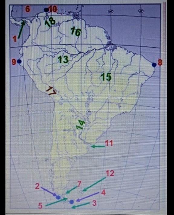 Мета: використовуючи фізичну карту Південної Америки, визначити, географічні об'єкти позначені на контурній карті цифрами, записати їх назви у табтитро та запам'ятати їх розміщення на материку: