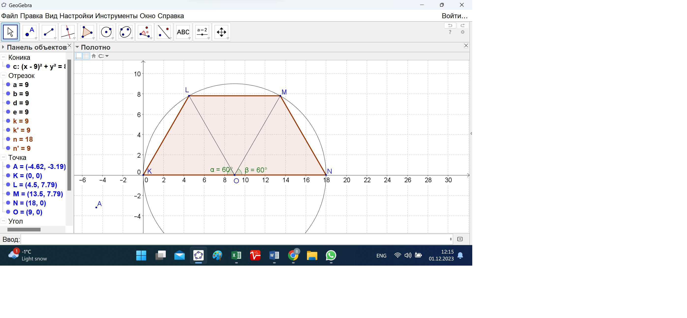 Получаем, что радиусы ОL и ОM делят полуокружность на 3 равные части по 60 градусов.