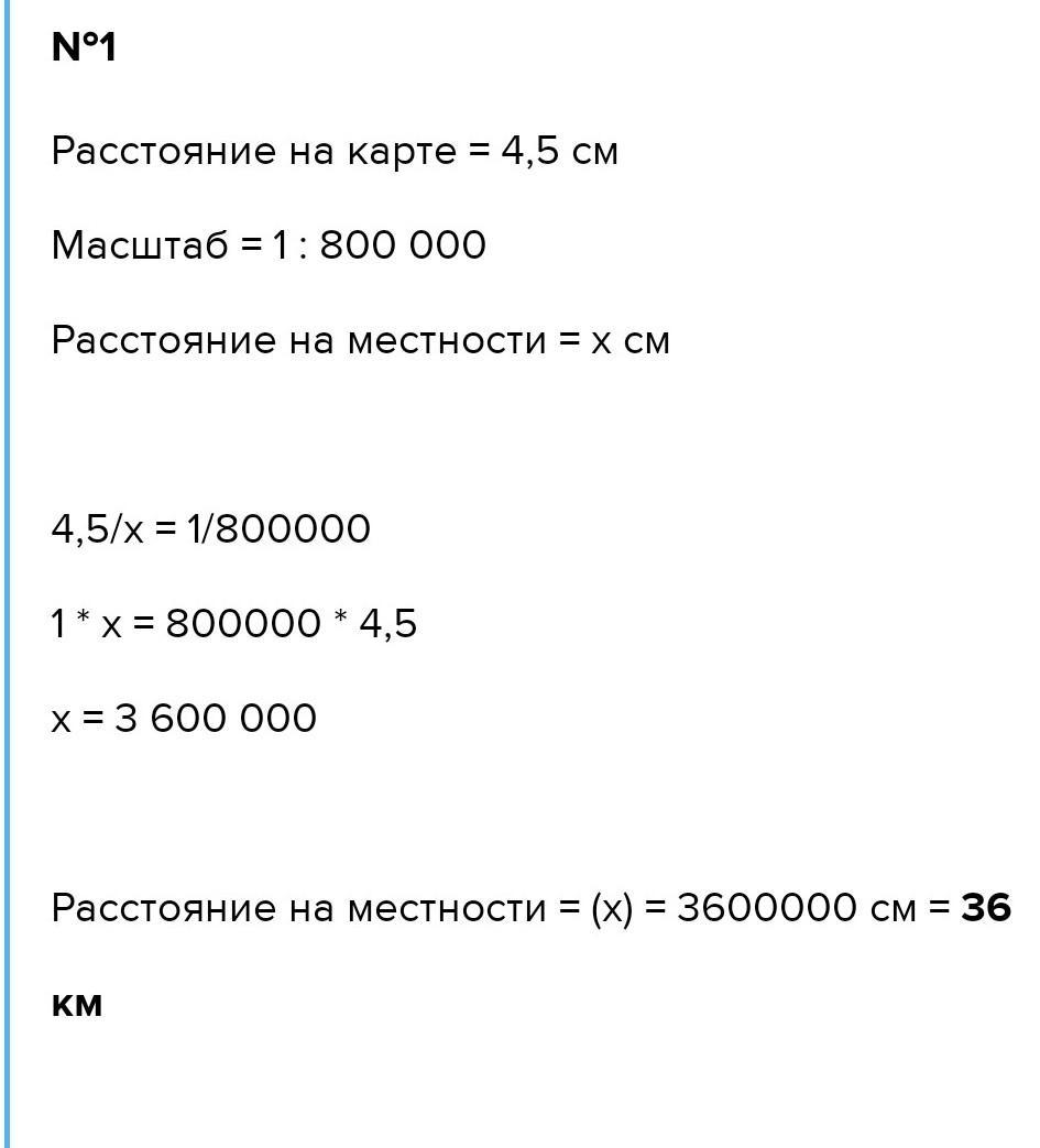 Знайди відстань між двома містами, якщо відстань між ними на карті з масштабом 1:800 000 дорівнює 4,5 см.