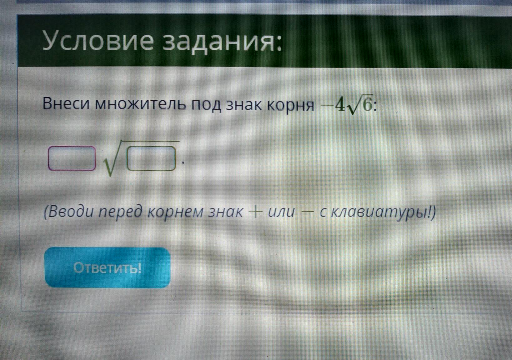 Чтобы внести множитель под знак корня, нужно минус (в данном случае) оставить за корнем, а число поднести в квадрат и записать как произведение с подкоренным числом под квадратным корнем.