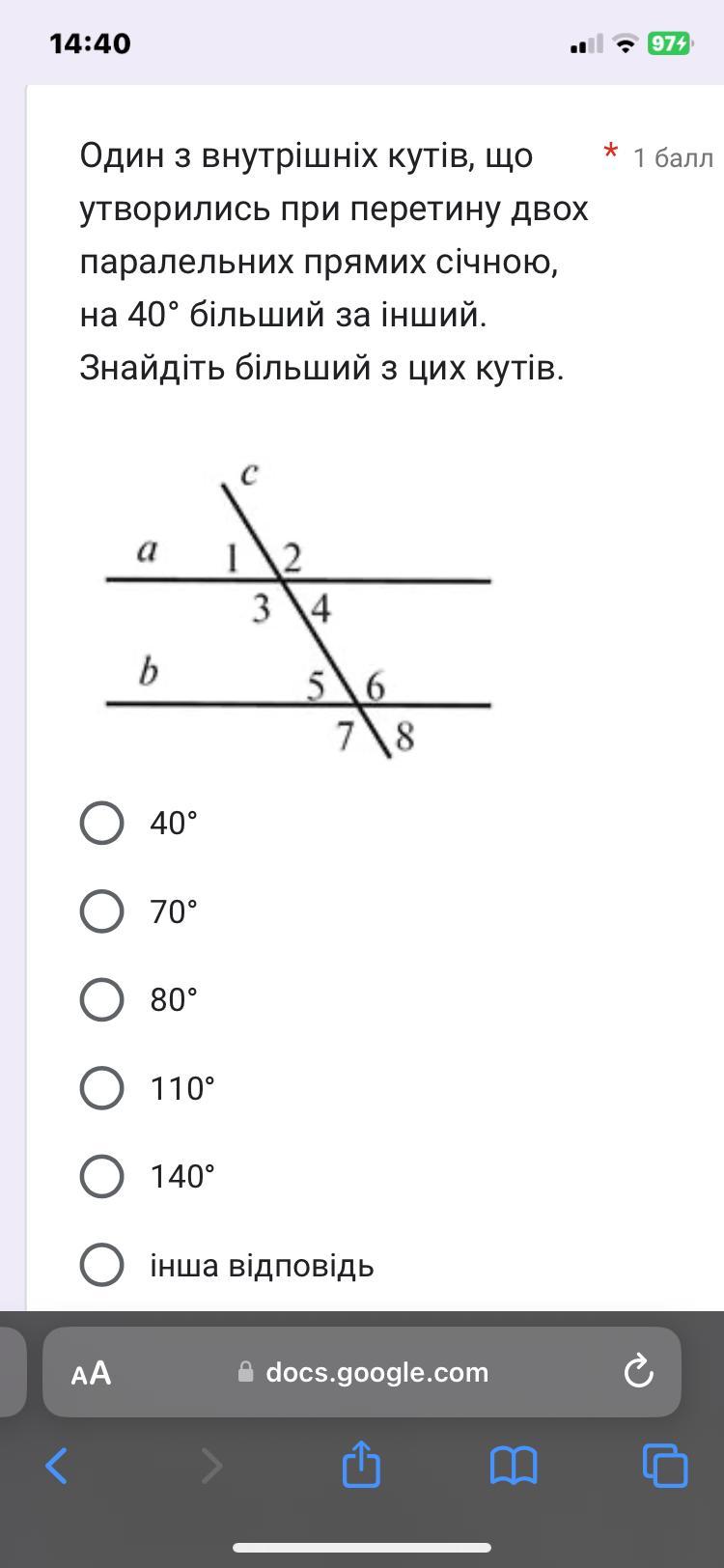 Объяснение:сума їх 180 градусів один на 40 більший за другий то маємо рівняння x+x=40=180 2x=140 x=70 70+40=110