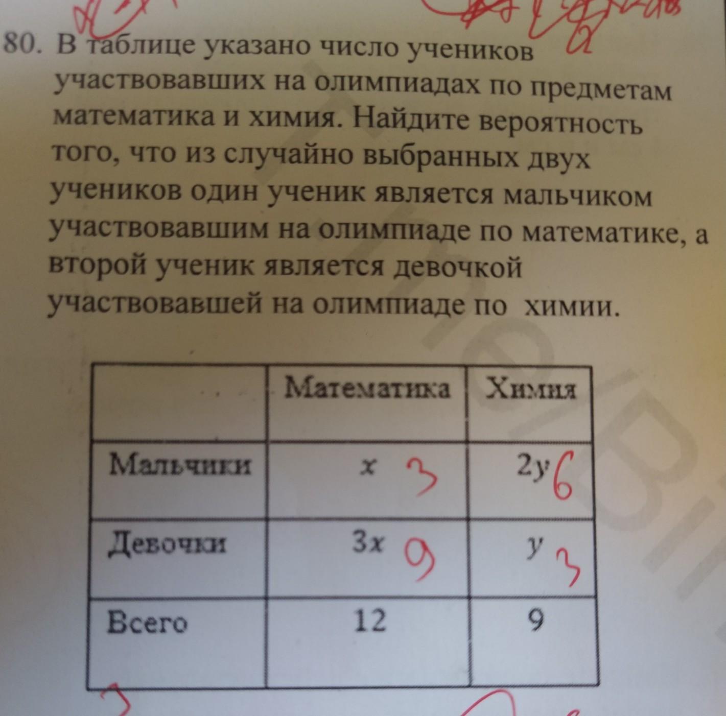 80. В таблице указано число учеников участвовавших на олимпиадах по предметам математика и химия. Найдите вероятность того, что из случайно выбранных двух учеников один ученик является мальчиком участвовавшим на олимпиаде по математике, а второй ученик является девочкой участвовавшей на олимпиаде по химии.