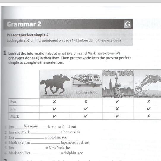 2. have ridden, 3. hasn't seen, 4. have eaten, 5. hasn't been, 6. haven't