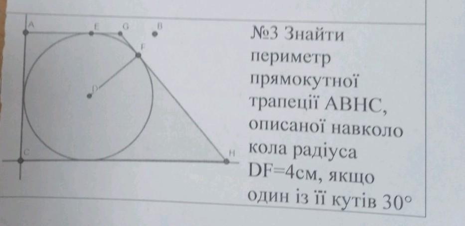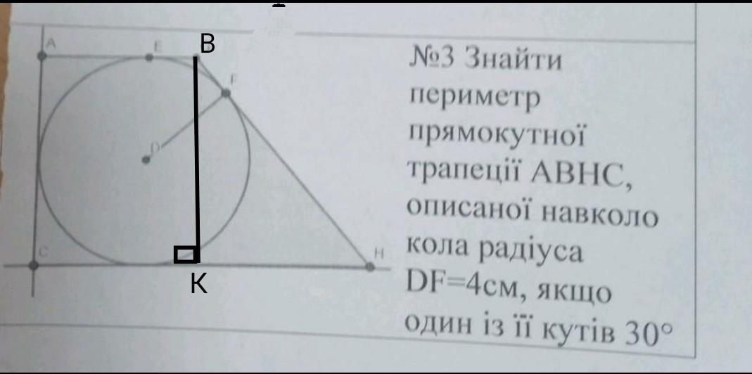 Знайти периметр прямокутної трапеції АВНС, описаної навколо кола радіуса DF=4см, якщо ОДИН З ЇЇ КУтiв 30°