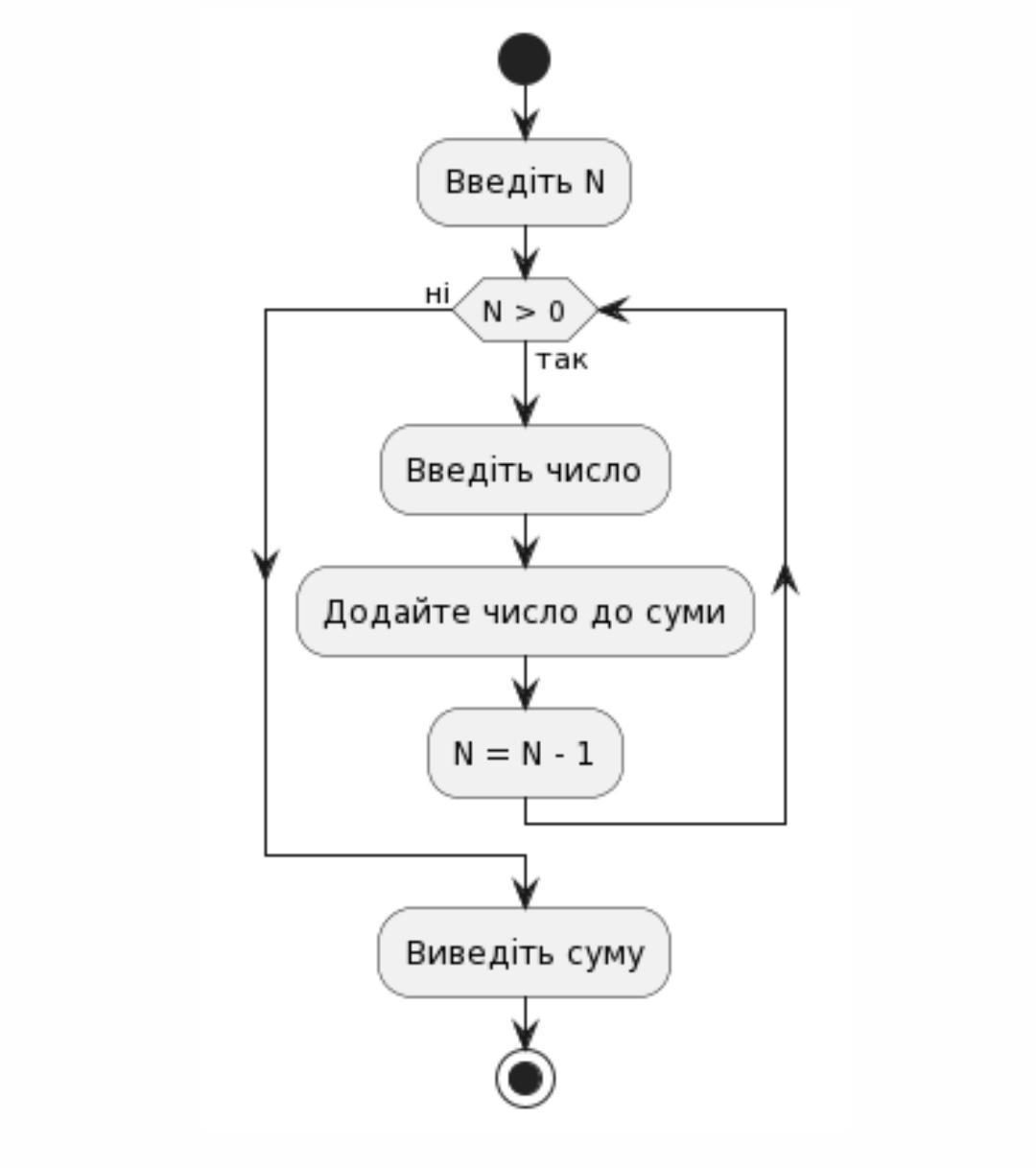 Накреслити блок-схему алгоритму обчислення суми N чисел, що вводяться з клавіатури. При зображенні блок-схеми необхідно дотримуватись норм ЄСПД.