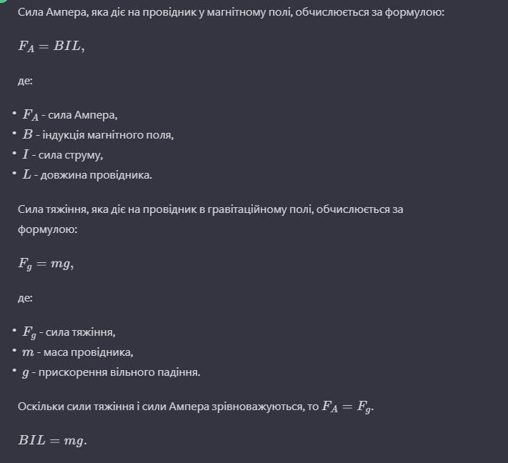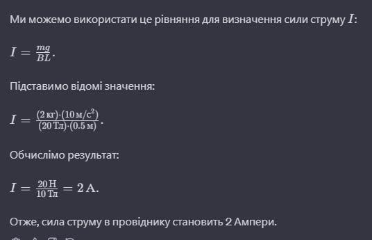 Прямолінійний провідник масою 2 кг і довжиною 50 см помістили в однорідне магнітне поле з індукцією 20 Тл перпенлдикулярно до ліній індукції. визначте силу струму в провіднику, якщо сила тяжіння зрівноважується силою Ампера. Прийміть g = 10 м/с2