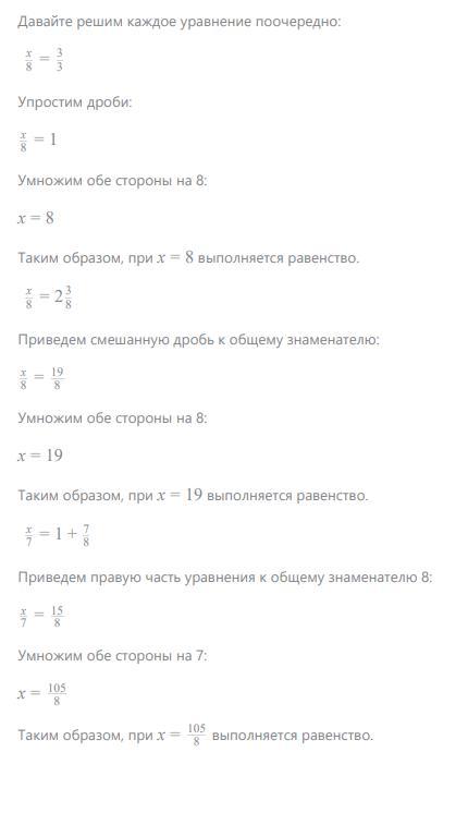 При каком значении х выполняется равенство:1) x/8=3/3; 2)x/8=2(целых)3/83)x/7=1+7/8