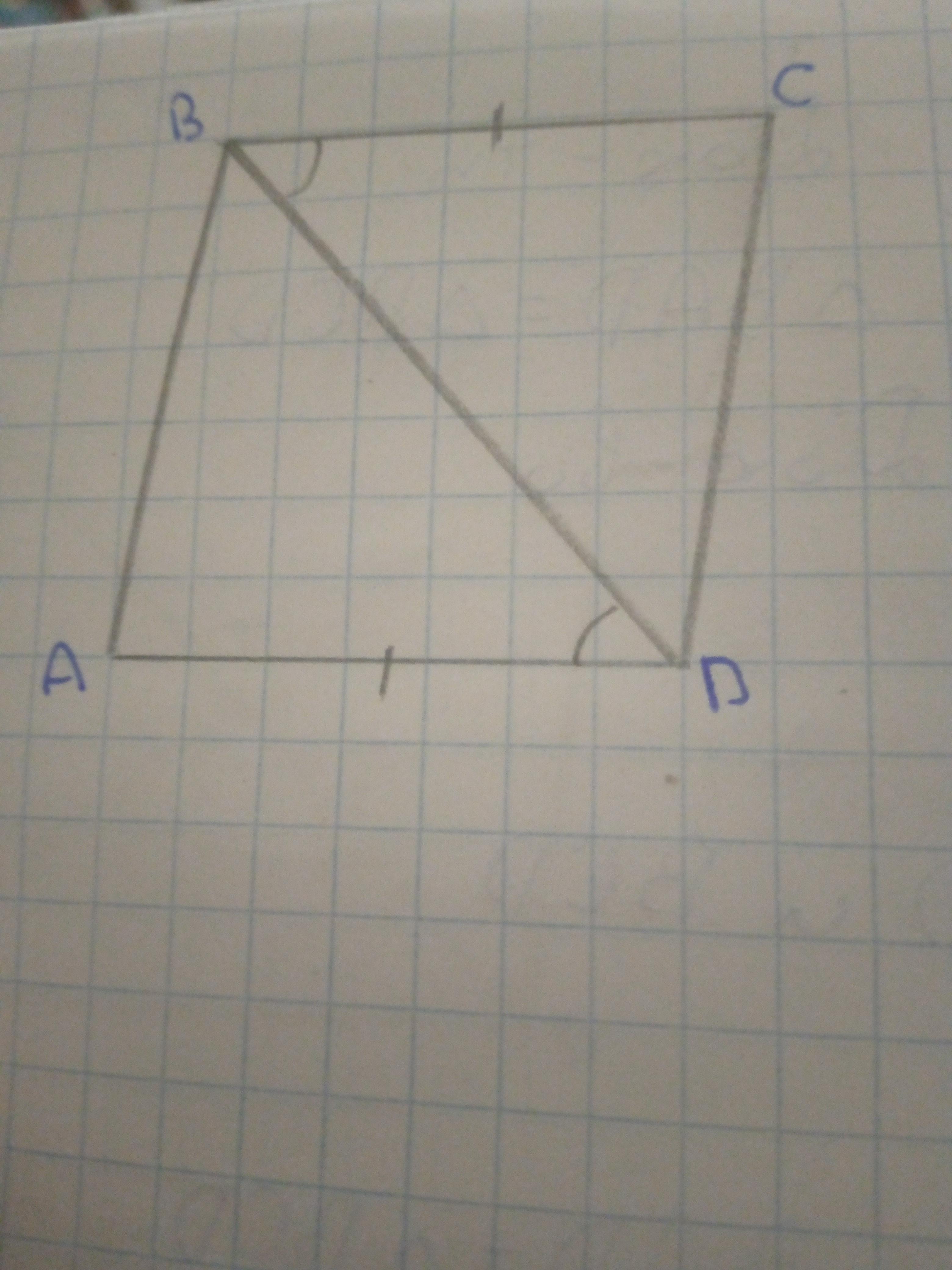 1) так как BD - диагональ, она делит на два равных треугольника и на основании этого треугольник ABD и DCB равны. если не знать этого факта, то можно доказать иначе: BD - общая сторона, AD=BC, <ADB=<CBD, и на основании этого треугольник ABD и DCB равны. можно еще третьим способом: <ADB=<CBD, <ABD=<CDB как разносторонние углы при секущей BD, <A=<C как вертикальные и на основании этого треугольник ABD и DCB равны за 3 углами.