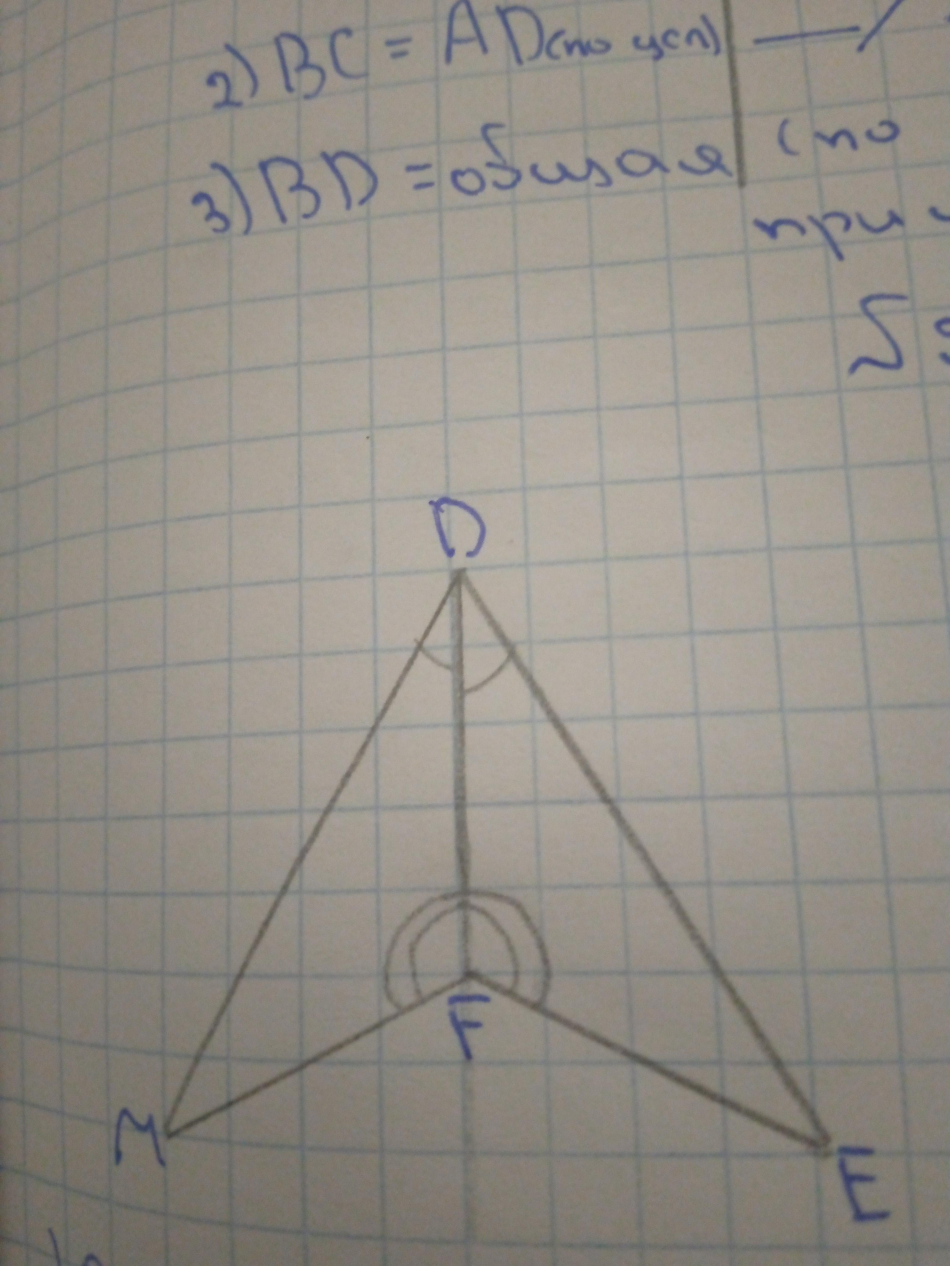 2) если два угла в одном треугольнике равны двум углам второго треугольника, то третья пара углов тоже равен и треугольник MDF и EDF равны за 3 углами. можно рассмотреть еще один вариант, что раз DF - общая сторона, <MDF=<EDF, <DFM=<DFE, то треугольник MDF и EDF равны за стороной и 2 углами, которые к ней прилежащие.