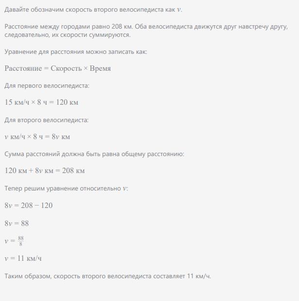 Из двух городов, расстояние между которыми 208 км , навстречу друг другу выехали одновременно два велосипедиста. Один из них ехал со скоростью 15 км/ч. Вычисли скорость второго велосипедиста, если известно, что они встретились через 8 ч.