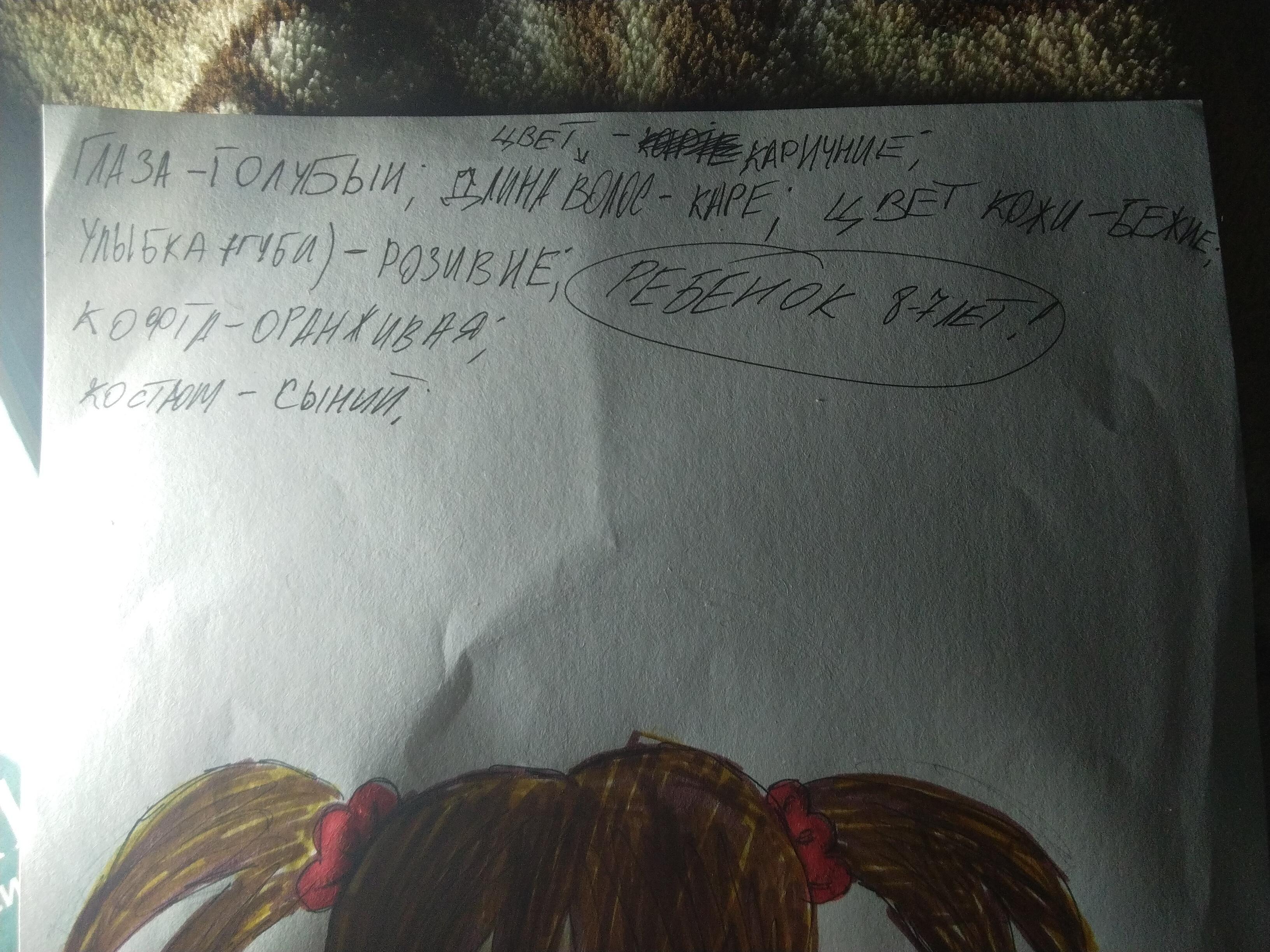 (То что должно быть указано) : цвет глаз, длина волос (или причёска) и цвет волос (может быть цветной), цвет кожи, есть ли улыбка, а так же ребенок или девушка.