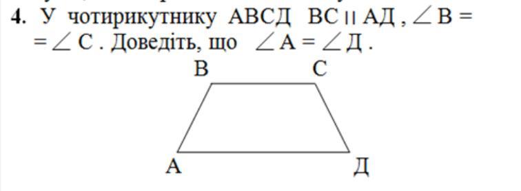 Так как BC||AD, то ∠B+∠A=180° и ∠C+∠D=180°, так как все эти углы внутренние односторонние. А так как ∠B=∠C, то и ∠A=∠D. Ведь если мы захотим найти угол А, то нам нужно будет от 180° отнять угол В, а чтобы найти угол D, нам нужно от 180° отнять угол С.