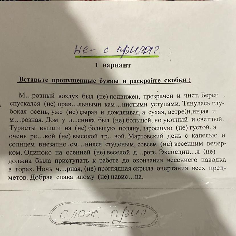 Морозный воздух был неподвижен (=спокоен), прозрачен и чист. Берег спускался неправильными (=сложными) каменистыми уступами. Тянулась глубокая осень, уже не сырая (есть противопоставление) и дождливая, а сухая, ветр/ен^/ая (исключение) и морозная. Дом у лесника был небольшой (=маленький), но уютный и светлый. Туристы вышли на небольшую (=маленькую) поляну, заросшую не густой (есть противопоставление), а очень редкой невысокой (=низкой) травой. Мартовский день с капелью и солнцем внезапно сменился студеным, совсем не весенним (относительное) вечерком. Одиноко на осенней невеселой (=грустной) дороге. Экспедиция не должна (крат.причастие) была приступать к работе до окончания весеннего паводка в горах. Ночь черная, непроглядная (без НЕ не употребляется) скрыла очертания всех предметов. Добрая слава злому ненавистна (без НЕ не употребляется) .