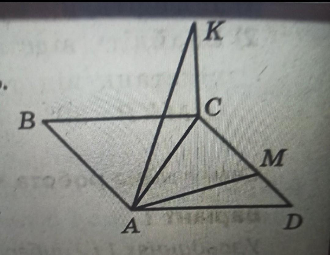 На рисунку КС - перпендикуляр до площини паралелограма АВСD, АМ - висота паралелограма. Укажіть кут між прямою АК і площиною паралелограма. Большое спасибо!