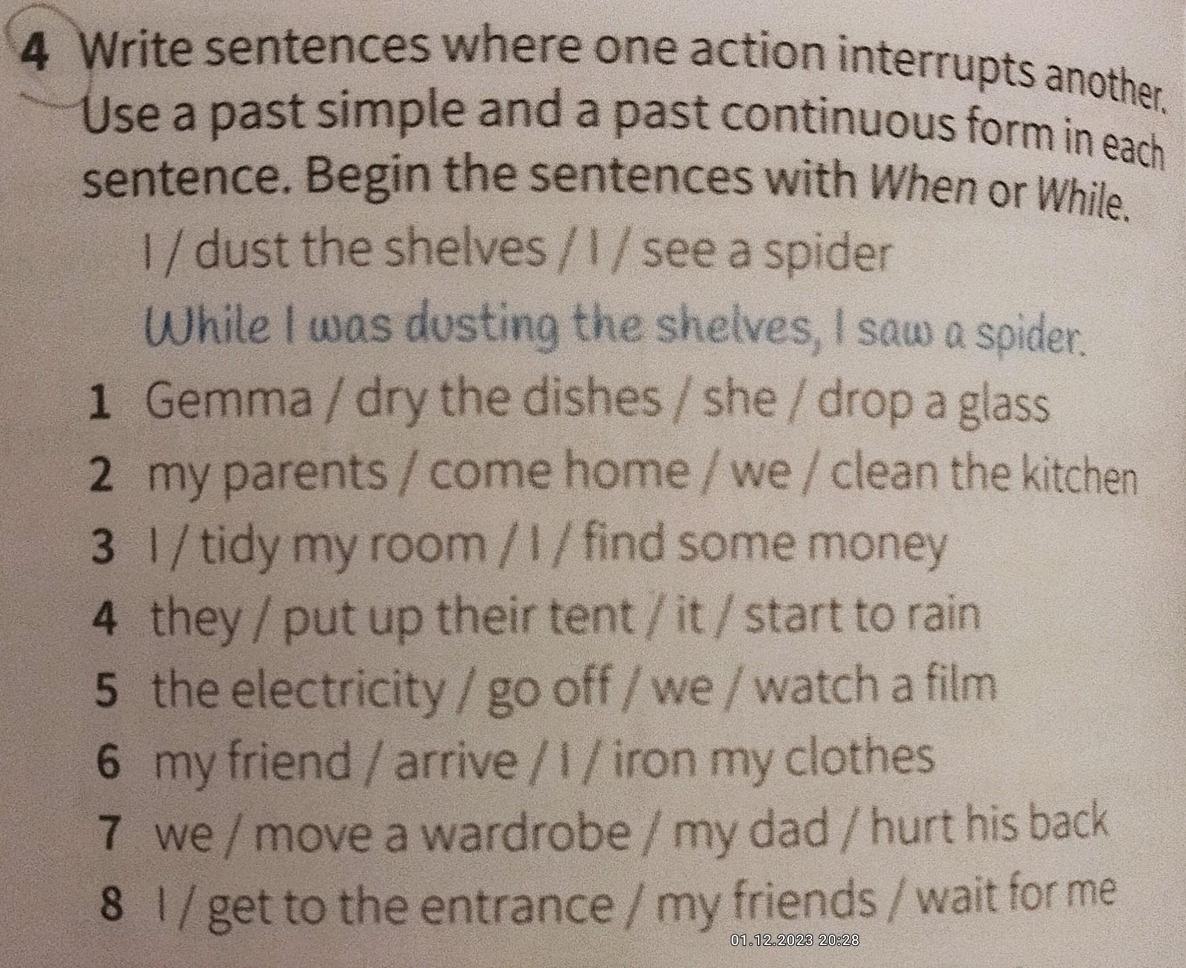 Write sentences where one action interrupts another Use a past simple and a past continuous form in each sentence. Begin the sentences with When or While. 1/dust the shelves/l/see a spider 1 While I was dusting the shelves, I saw a spider. Gemma / dry the dishes/she/ drop a glass 2 my parents/come home/we/ clean the kitchen 3 l/tidy my room/1/find some money 4 they/put up their tent/it/start to rain 5 the electricity/ go off/we/watch a film 6 my friend/arrive/1/iron my clothes 7 we/move a wardrobe / my dad / hurt his back 8 1/get to the entrance / my friends / wait for me