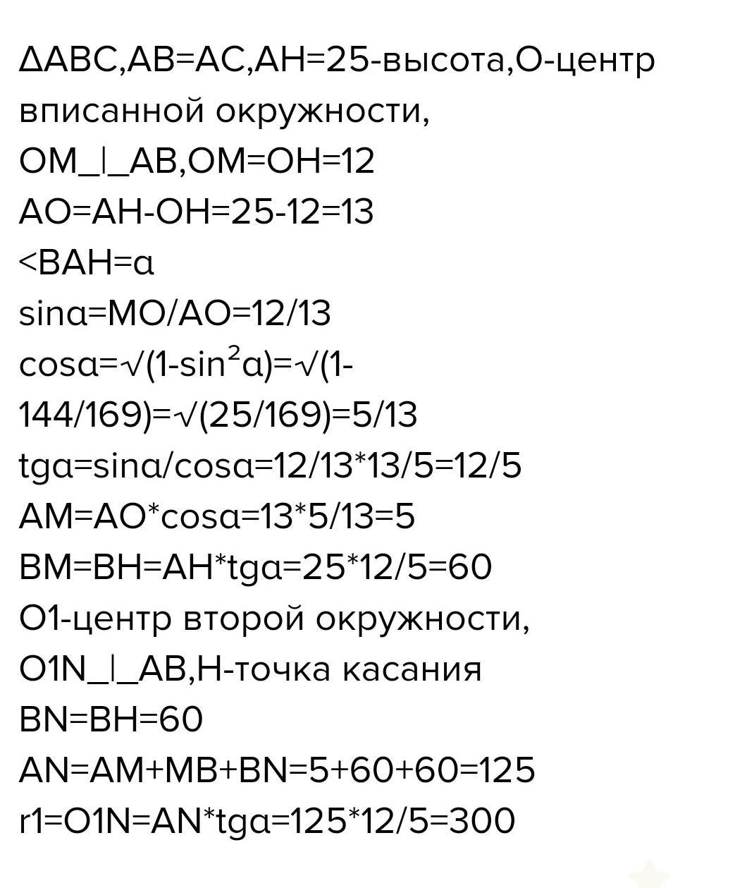 5. Высота, опущенная из вершины на основание равнобедренного треугольника 25 см. Найдите длину медианы, проведенной к боковой стороне, если она составляет с основанием угол 30°