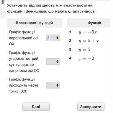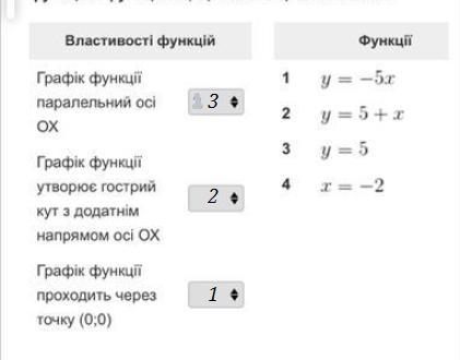 Графики функций , которые проходят через начало координат, имеют вид y = kx . Это функция №1 : y = -5x .