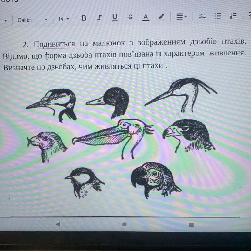 2. Подивиться на малюнок з зображенням дзьобів птахів.
