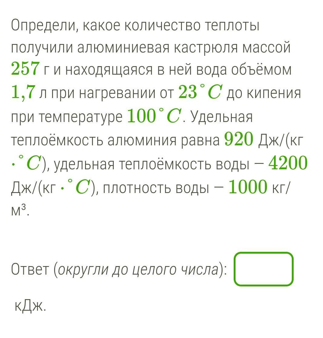 Общее количество теплоты, полученное алюминиевой кастрюлей и водой, равно: