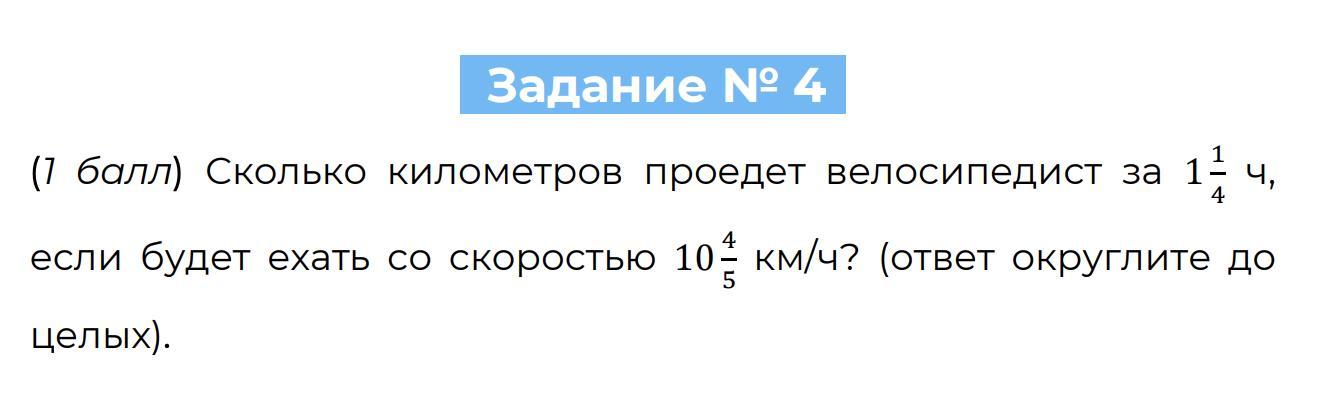10 4/5 * 1 1/4 = 54/5 * 5/4 = 27/1 * 1/2 = 27/2 = 13,5 ≈ 14 (км) - проедет велосипедист