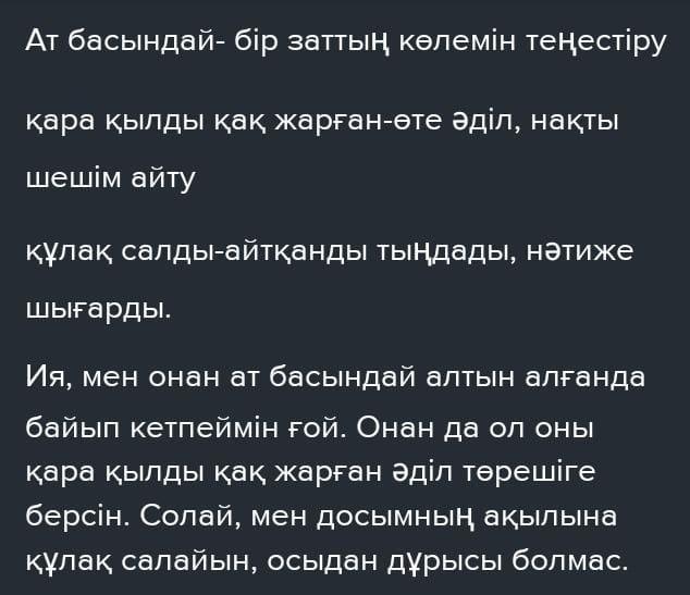 10. Берілген тұрақты тіркестердің мағынасын түсіндір. Тұрақты тіркестерді белгілі бір мамандықпен байланыстырып, монолог құрас- тырып жаз. Ат басындай, көзді ашып-жұмғанша, қара қылды қақ жарған, құлак салды.