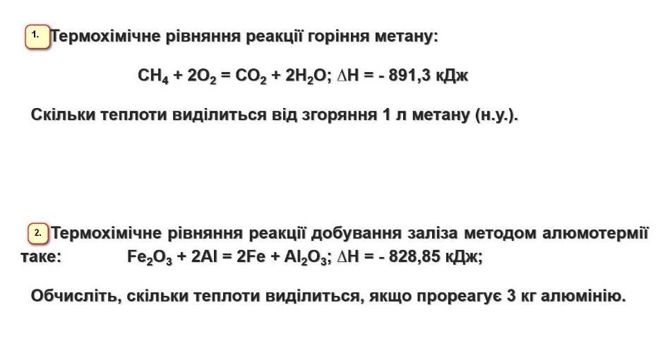 1. Термохiмiчне рівняння реакції горіння метану: CH4 + 2O2 = CO2 + 2H2O; ∆H = - 891,3 кДж Скільки теплоти виділиться від згоряння 1 л метану (н.у.).