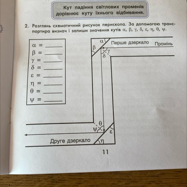 !!ТЕРМІНОВО!!Розглянь схематичний рисунок перископа. За допомогою транспортера визнач і запиши значення кутів a,B,Y,Б,E,n,Q,W