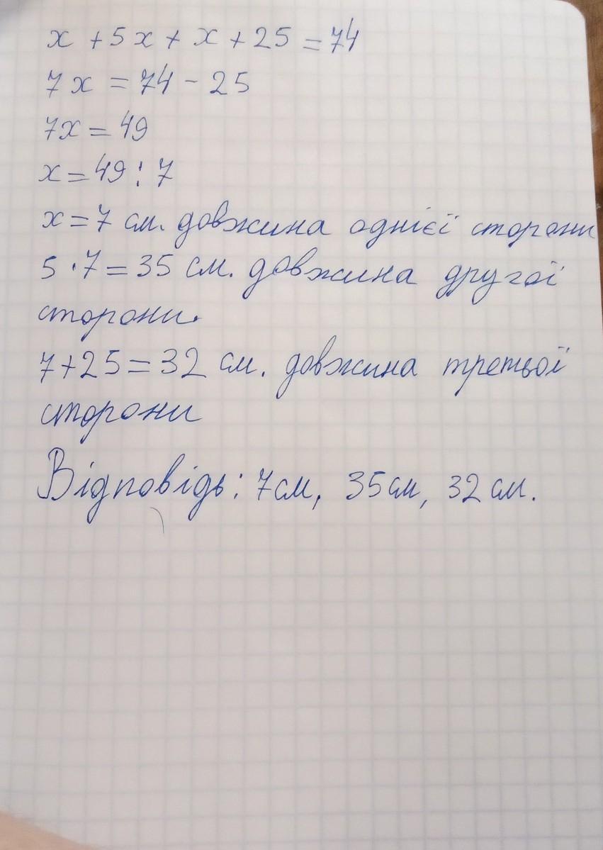 Одна зі сторін трикутника в 5 разів менша від другої і на 25 см менша від третьої. Знайдіть сторони трикутника, якщо його периметр дорівнює 74 см.не рівнянням!!!