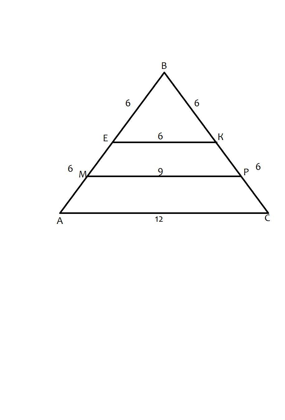 Дано: ΔАВС, АВ=ВС=АС=12 см.; ЕК - середня лінія; ЕВК - трикутник, АЕКС - трапеція, МР - середня лінія трапеції. МР - ?