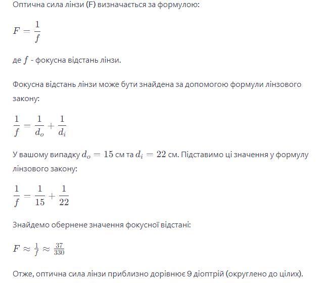 Визначити оптичну силу лінзи, якщо предмет розташований на відстані 15 см від лінзи, а зображення предмета знаходиться на відстані 22 см від лінзи. (запишіть отриману відповідь, округливши отримане число до цілих)