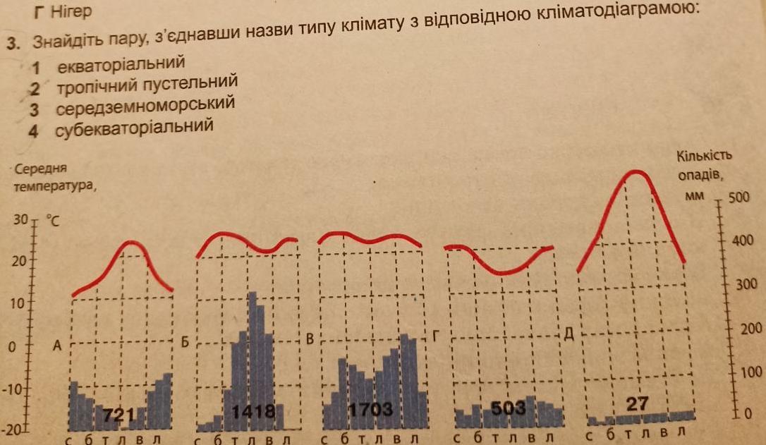 Возле климатодиаграммы есть буквы их надо соиденить с цыфрами