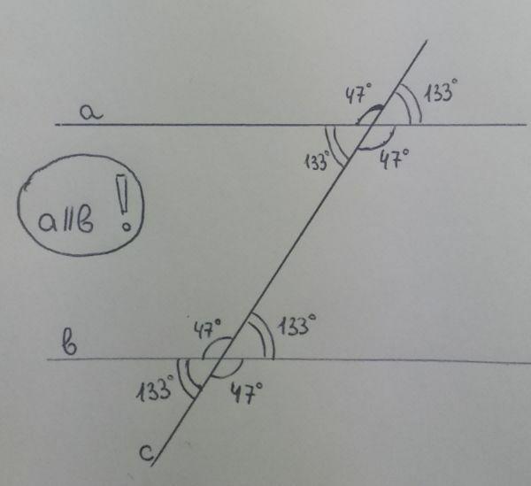 один з кутів що утворився при перетині паралельніх прямих січною дорівнює 47 градусів,знайдіть решту кутів. Зробіть малюнок