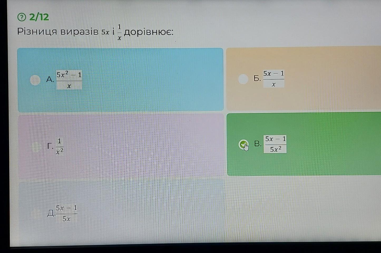 Ⓒ2/12 Різниця виразів 5х і - дорівнює: X А. Г. 5x2-1 Д. 1 *2 X 5x-1 5x Б. 5x − 1 Х 5x 1 5x2