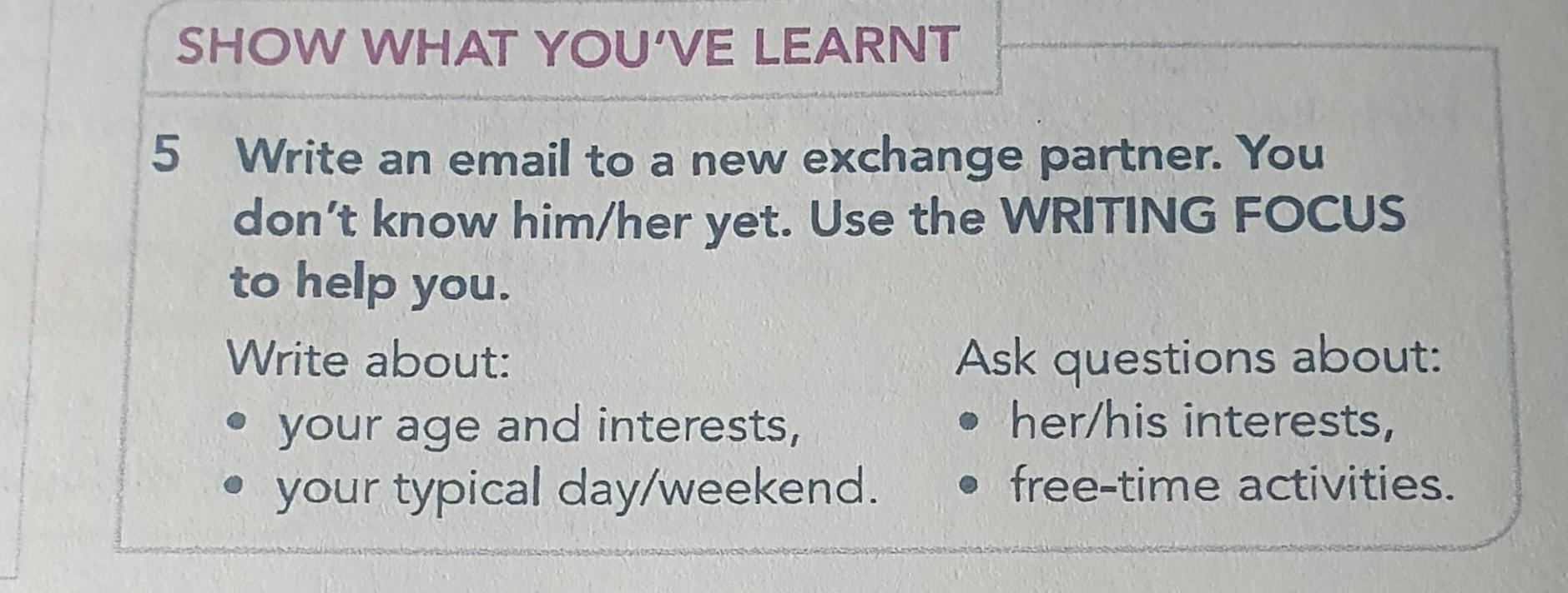 Dear [Exchange Partner's Name],I hope this email finds you well and in great spirits. My name is [Your Name], and I am thrilled about the prospect of embarking on this exchange journey with you. It's always exciting to connect with new people and learn about different cultures and lifestyles.To kick things off, I'd love to get to know you better! If you don't mind, could you share a bit about yourself? For starters, I'm curious about your age and interests. It would be great to know what activities and hobbies you're passionate about.As for me, I'm [Your Age] years old and enjoy [mention a couple of your interests or hobbies]. I'm always on the lookout for new experiences and perspectives, and I'm eager to discover what makes you tick.Tell me about your typical day or weekend – I'm interested in learning more about your daily routines and how you spend your free time. Whether it's exploring local attractions, indulging in a favorite pastime, or simply relaxing with a good book, I'm keen to hear all about it.Speaking of free time, what are your go-to activities when you have a moment to unwind? Do you have any favorite books, movies, or music that you enjoy? I'm always open to recommendations and love discovering new things.I believe that understanding each other's interests and routines will not only help us connect better but also make our exchange experience even more enriching. I'm genuinely looking forward to getting to know you and creating lasting memories together.Feel free to share as much as you're comfortable with, and I can't wait to hear from you soon! Best regards, [Your Name]