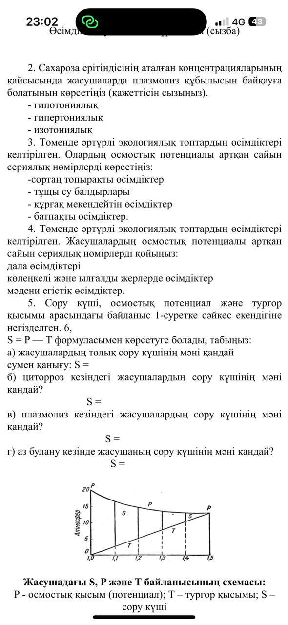 - **в) плазмолиз кезіндегі жасушалардың сору күшінің мәні қандай? S = P — T**