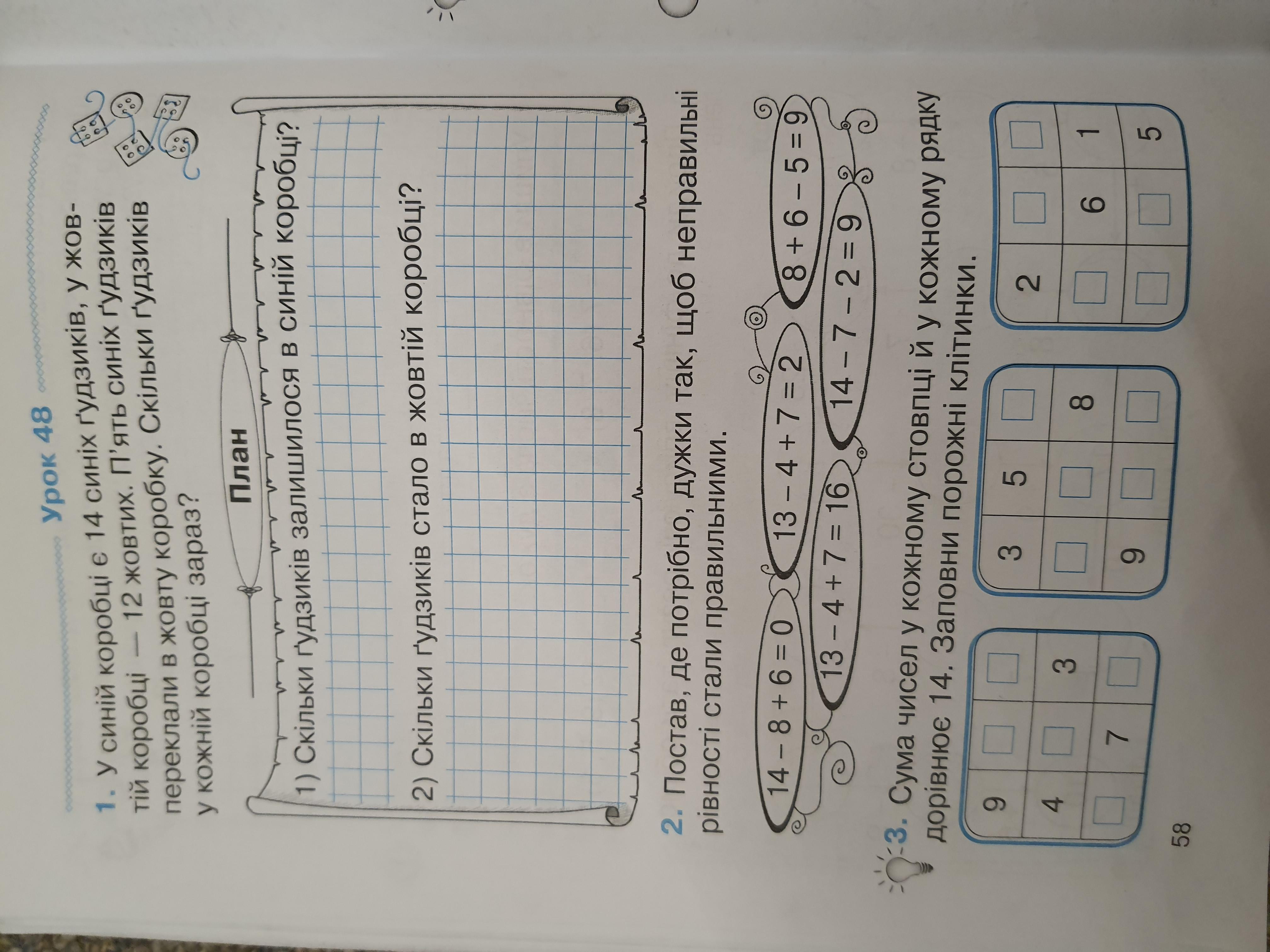 1 дія: 14 - 5 = 9 - гудзиків залишилось у синій коробці