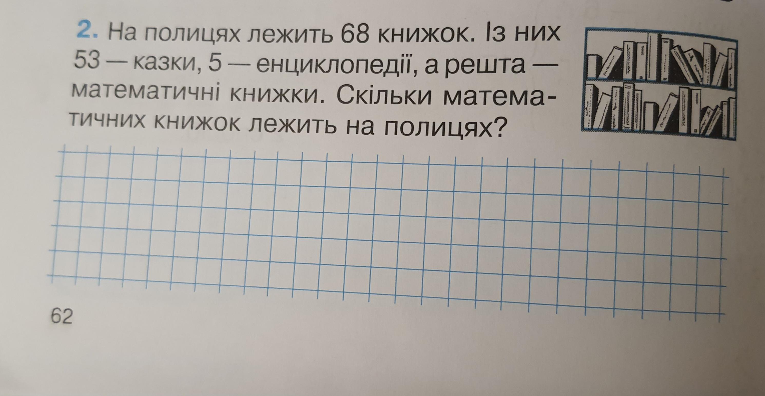 Чтобы найти сколько математических книг, надо от всех книжек отнять сказки и энциклопедии:
